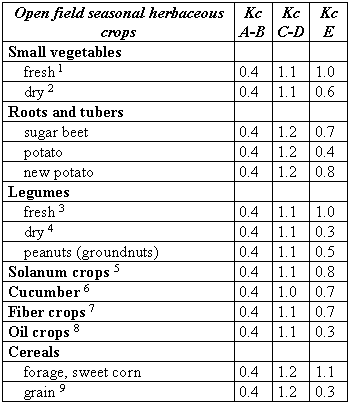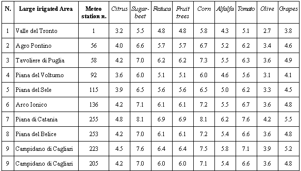 The crops are the main crops grown in Southern Italy, according to ISTAT statistics (1998). Kc values have been established on the basis of various sources (Doorenbos and Pruitt, 1977; Snyder, 1999; Pereira and Allen, 1999) and the authors' personal experience. Kc data have only one decimal figure and the crops have been as far as possible grouped.